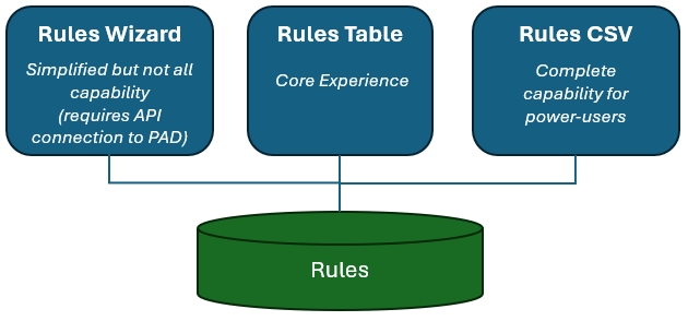 The three user interfaces represent an evolution of capability. Rules CSV is largely a database representation of the rules and is therefore very detailed and not very user-friendly. This was the first user interface for rules and involves exporting a csv file, modifying it, then re-importing. The Rules Table was introduced to make this easier by providing an in-tool and more user-friendly interface to work with rules. Lastly the Rules Wizard was released which guided the user through a rules-enabled export. It provides guidance information on what the rule settings do, real-time pickers to make configuring the rules easier, and displays only those rules that are relevant for the current export. This is summarized in the table below.